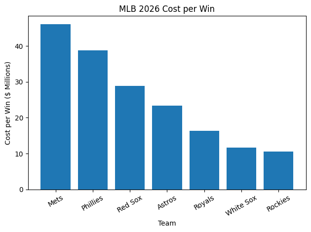 The Colorado Rockies are the most “efficient” here (not amazing, but least wasteful). The New York Mets are in a completely different universe—spending 4–5x more per win than the Rockies. There’s a $35M gap per win between top spender inefficiency and bottom spender efficiency.